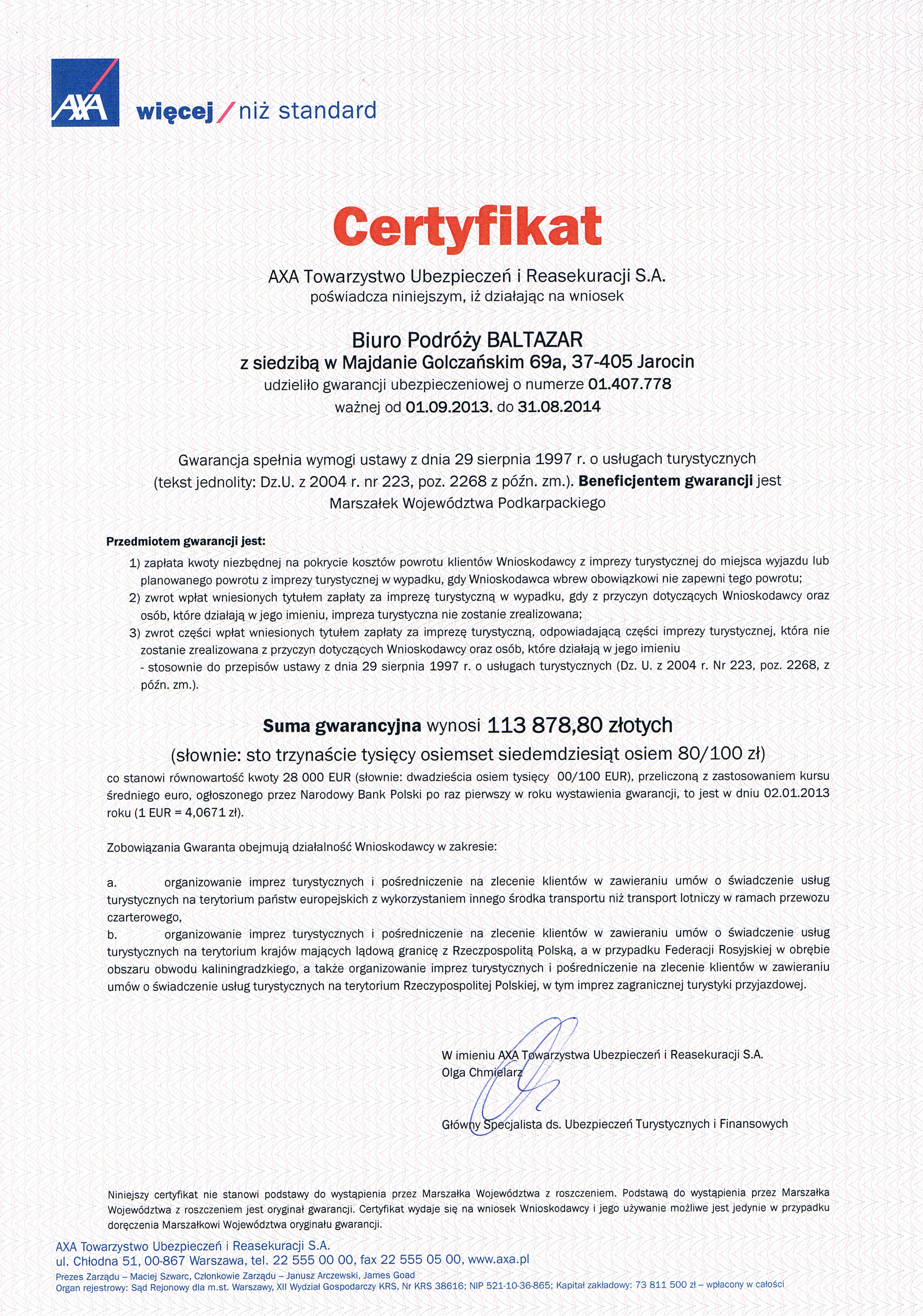 Biuro posiada gwarancję ubezpieczeniowową na kwotę 113 878,80 PLN