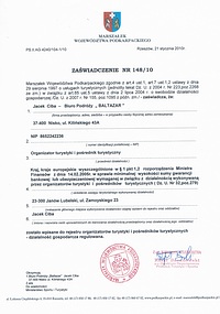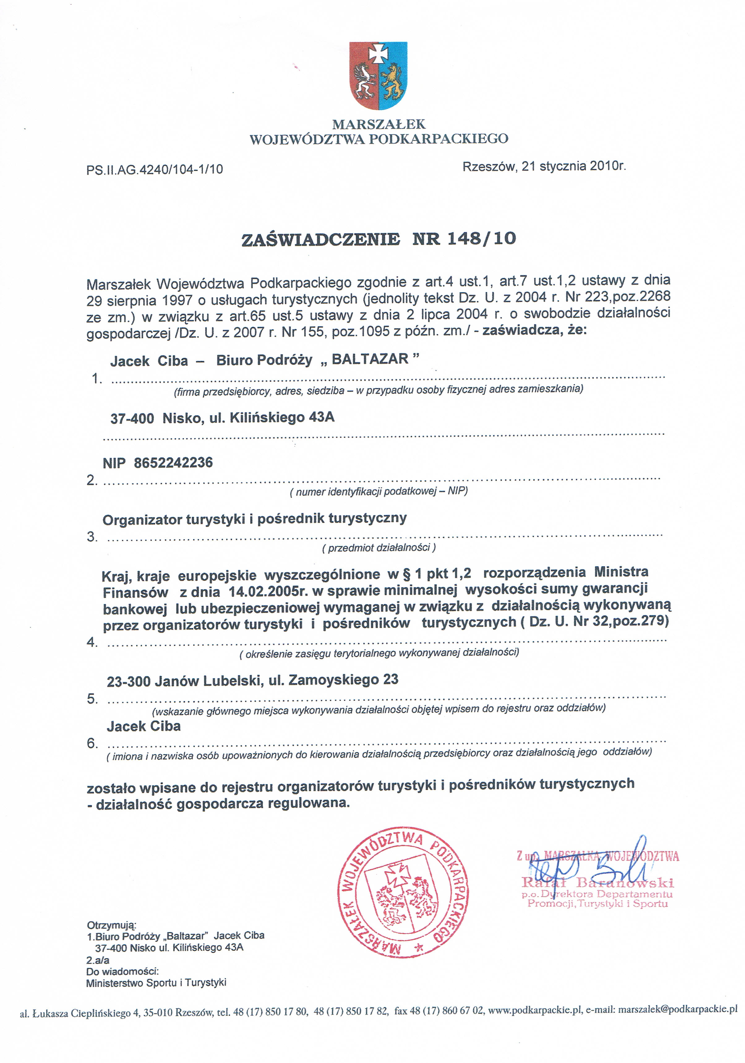 Jesteśmy biurem wpisanym do Centralnego Rejestru Organizatorów Turystki przez Marszałaka Województwa Podkarpackiego (od 2007 roku)